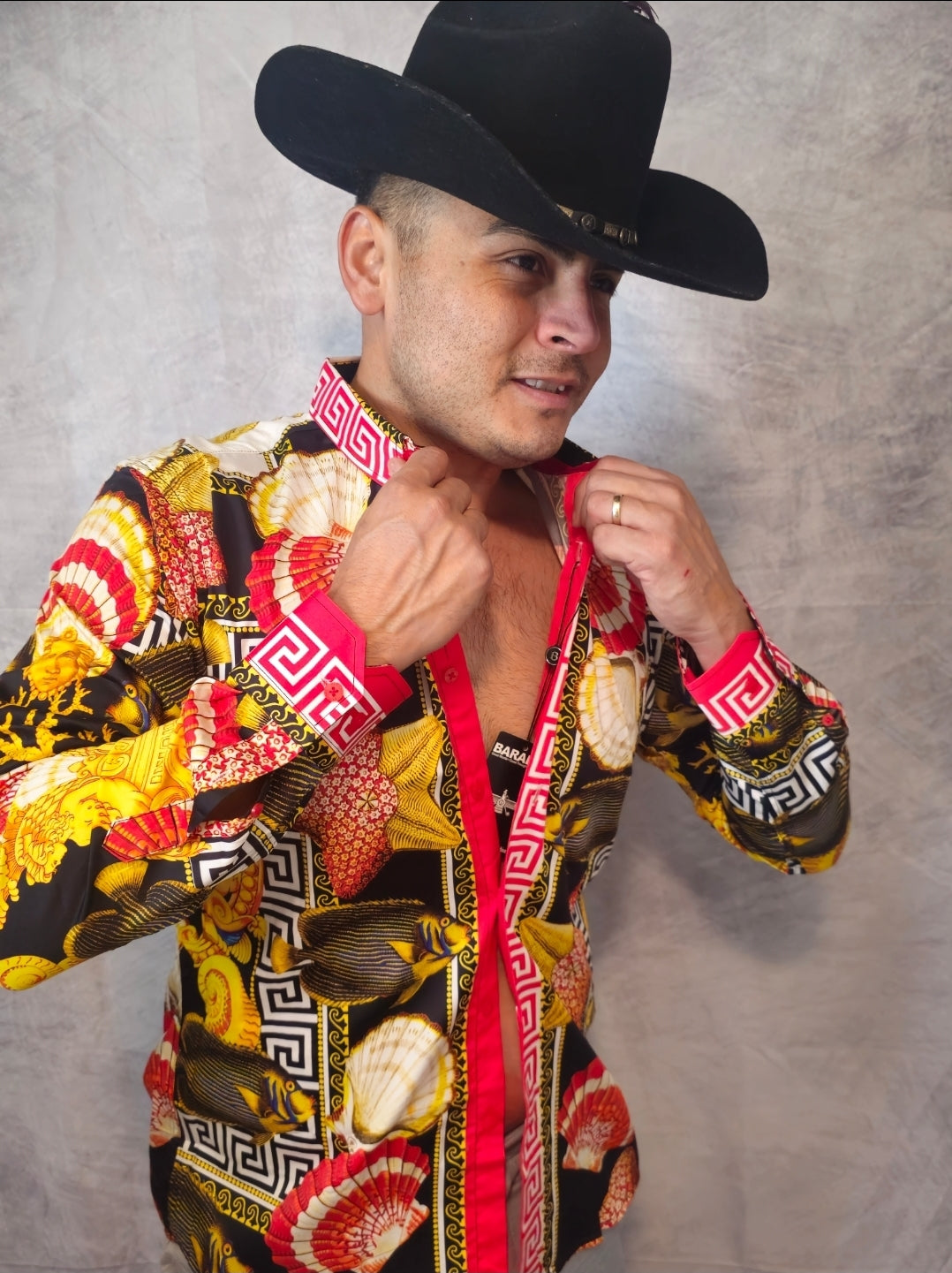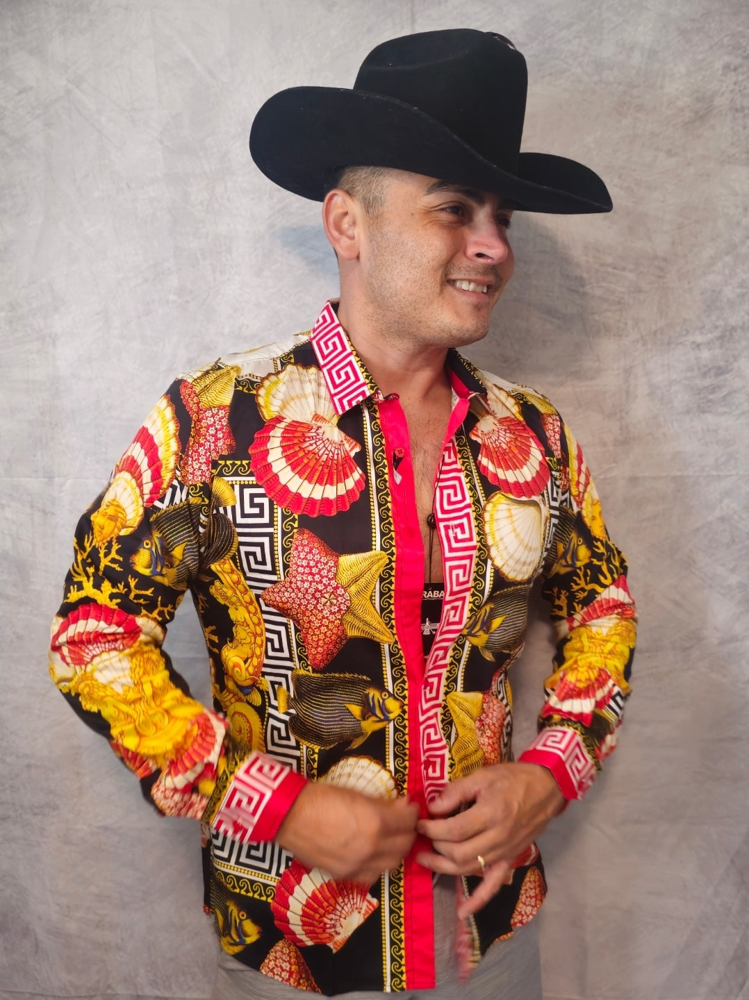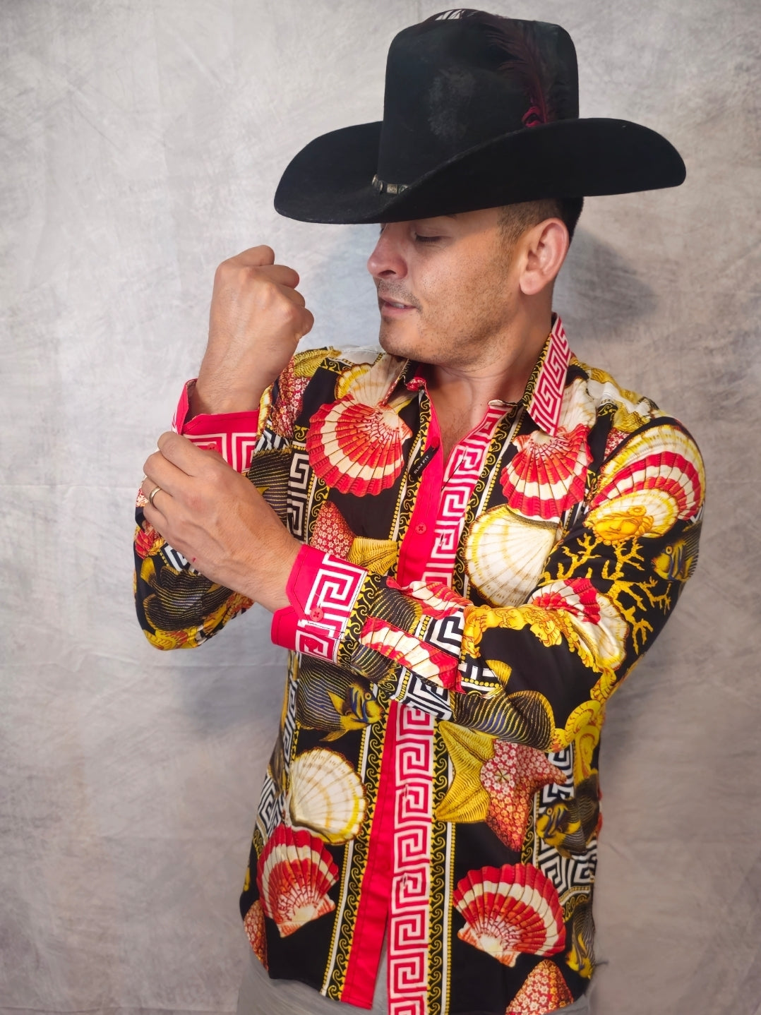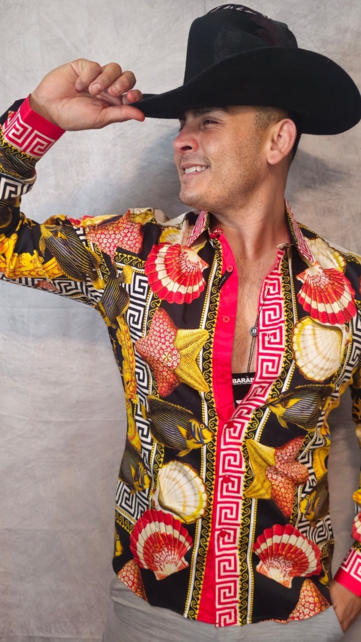This men's button-down shirt features a distinctive sea animals motif intertwined with sea creatures and a Greek key pattern on breathable fabric, delivering a bold jungle-inspired aesthetic. Designed with unique collars and a slim-fit cut, it includes long sleeves and a button-up front. An exclusive Barabas design, it blends refined style with expert craftsmanship.